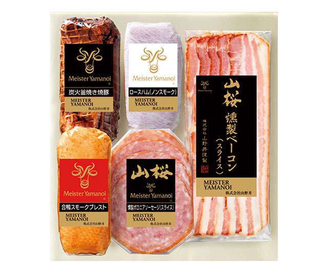 - 炭火釜焼き焼豚170g、ロースハム(ノンスモーク)60g、山桜燻製ボロニアソーセージ(スライス)40g、山桜燻製ベーコン(スライス)45g/日本製、合鴨スモークブレスト130g/タイ製