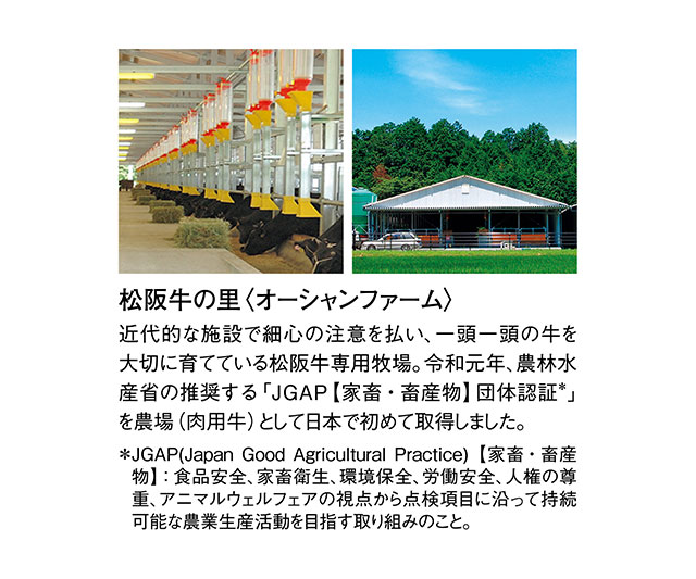 きめ細かな霜降り、柔らかな肉質、とろけるような脂のまろやかさで、日本のブランド牛として名高い松阪牛。今回は血統を重視した仔牛の仕入れや徹底した衛生管理など、こだわりを貫く三重県〈オーシャンファーム〉で生産された品々をご紹介します。美味しくなる時期を見極め食べ頃でお届けするので、松阪牛が本来持つ旨みと、繊細で力強い味わいをご堪能いただけます。