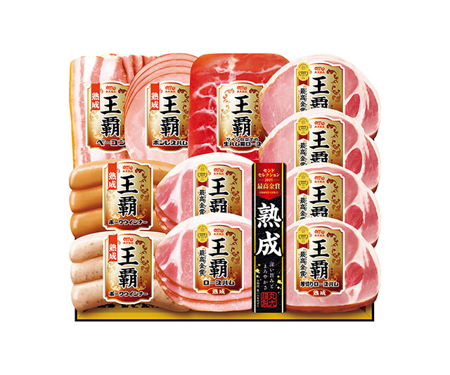 - 熟成ロースハム40g×2、熟成ベーコン45g・熟成ボンレスハム50g・ワイン仕立ての生ハム肩ロース50g・熟成ポークウインナー(プレーン)102g・熟成ポークウインナー(ハーブ)102g×各1、熟成厚切りロースハム55g×4