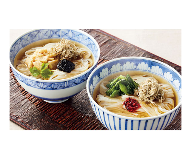 (即席手延素麺・鰹だし・かえし・とろろ昆布・紀州梅・小松菜)×4、(即席手延素麺・鰹だし・かえし・とろろ昆布・海苔佃煮・油揚げ)×4