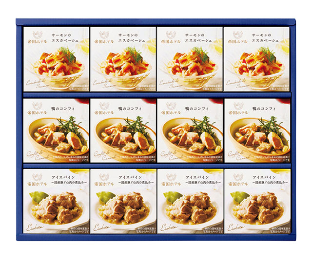 - サーモンのエスカベーシュ・アイスバイン(国産豚すね肉の煮込み)・鴨のコンフィ各85g×各4/プルトップ缶