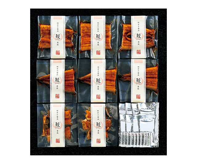 - うなぎ蒲焼カット×6(計270g)、うなぎ蒲焼きざみ×2(計90g)、たれ・山椒×各8