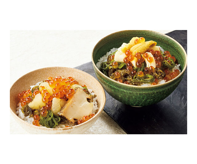 めかぶしょうゆ漬にいくらやあわび、うになど海の幸を盛り付けた、見た目も美しい一品です。酒肴や海鮮丼など、お好みの召しあがり方でお楽しみください。