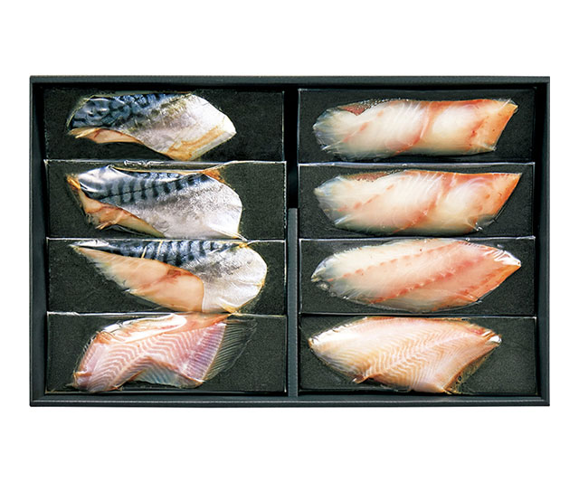真だらや赤かれいなど、ふっくらした身と潮の香り豊かな一汐(ひとしお)干しの詰合せです。越前塩を10年以上継ぎ足した塩水を使用し、角のないまろやかな味わいに仕上げました。