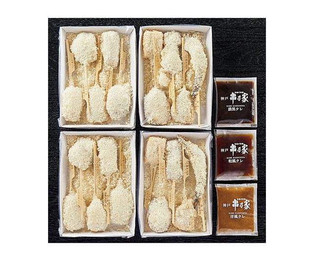 - 車海老・神戸牛・帆立貝・淡路どりササミ・ポークロール・神戸牛とこんにゃく・洋風蒸し・射込れん根・鮭・鳴門金時×各2、タレ3種×各1