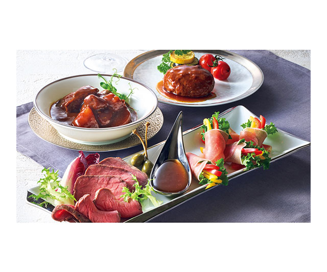 - ローストビーフ(もも)200g・トリュフ入りグレイビーソース30g×各1、ビーフシチュー180g・生ハムロース45g×各2、クリームチーズ入りハンバーグ(デミグラスソース・テリヤキソース各77g×各2)