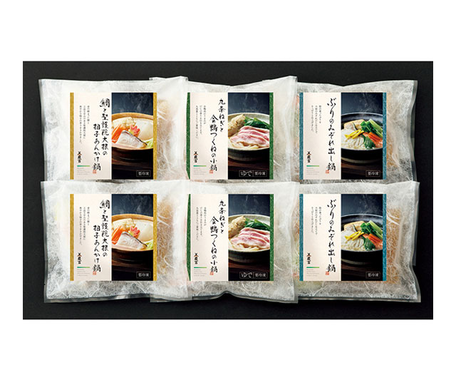 - 鯛と聖護院大根の柚子あんかけ鍋300g・ぶりのみぞれ出し鍋300g・九条ねぎと合鴨つくねの小鍋400g×各2(1人前×6)