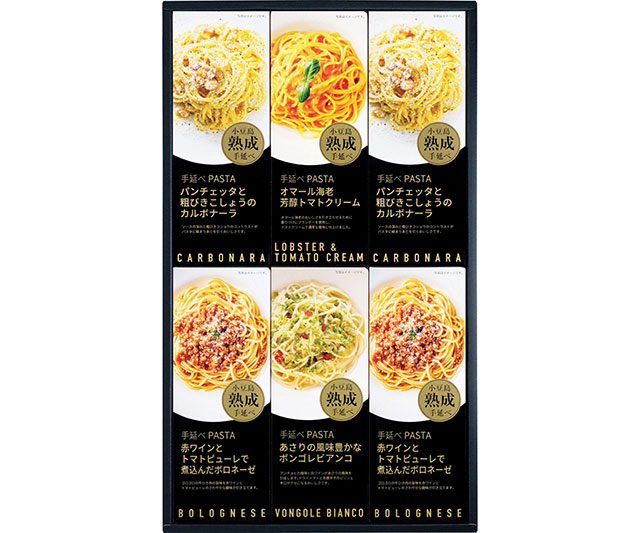 - 手延べパスタ80g×6、ボロネーゼ・カルボナーラ×各2、オマール海老トマトクリーム・ボンゴレビアンコ×各1