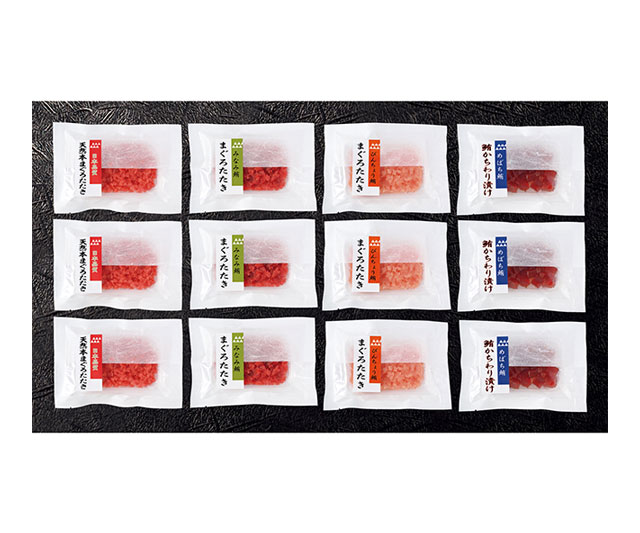 - 本まぐろたたき・南まぐろたたき・目鉢まぐろかちわり漬け・びんちょう鮪たたき各60g×各3