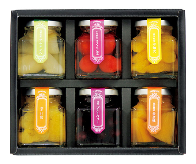 - コンポート(熊本県産不知火・山形県産ラ フランス・岡山県産黄金桃・国産ブルーベリー・国産甘夏各55g、山形県産さくらんぼ35g)