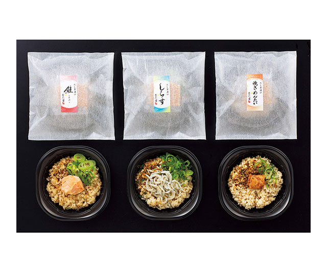 だしで炊きあげたご飯に、三越伊勢丹限定の瀬戸内海産しらすなど3種の具材をのせただし茶漬け。お湯を注ぐだけで引き立てのような豊かなだしの香りが広がります。