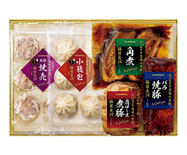 - 恵味の黒豚小籠包180g(6個)、恵味の黒豚大粒焼売300g(6個)、恵味の黒豚バラ焼豚170g、恵味の黒豚肩ロース煮豚・恵味の黒豚角煮各250g