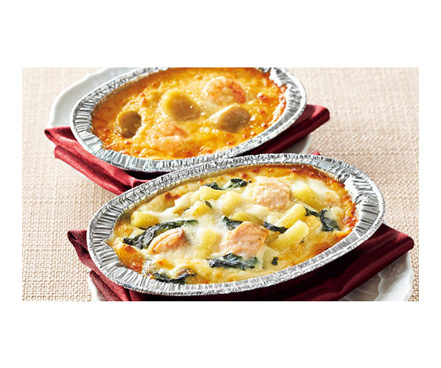 コクのあるホワイトソースが魅力のグラタン2種と、伝統のカレーソースで仕上げたカレードリア、色鮮やかなパプリカ風味ソースを使ったシーフードドリアのセットです。
