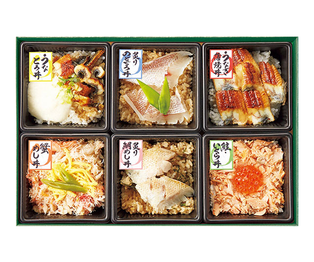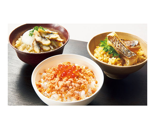 - うなとろ丼(うなぎは国産)・蟹めし丼・うなぎ蒲焼丼(うなぎは国産)各135g、鮭いくら丼・炙り鯛めし丼・炙りのどぐろ(赤ムツ)丼各125g