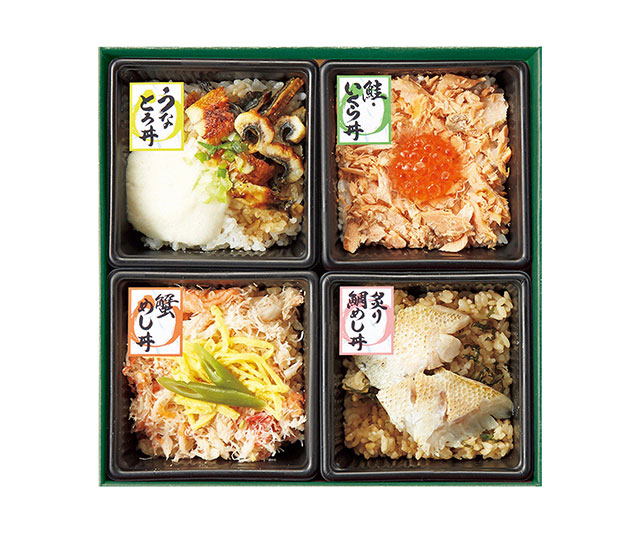 - うなとろ丼(うなぎは国産)・蟹めし丼各135g、鮭いくら丼・炙り鯛めし丼各125g