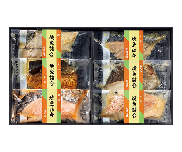 - 銀だら粕漬焼・赤魚味噌漬焼・さば塩焼・銀鮭粕漬焼×各1、ぶり味噌漬焼×2、各50g