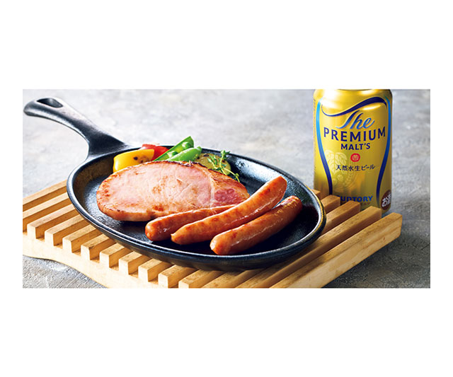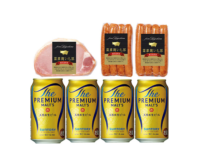 華やかな香りと深いコクが特徴の「ザ・プレミアム・モルツ」。柔らかな肉質の「薩摩麹いも豚」のハム・ウインナーをセットにした、ビール好きにはたまらない詰合せです。
