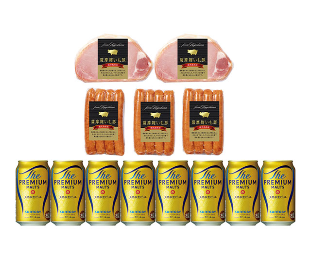 華やかな香りと深いコクが特徴の「ザ・プレミアム・モルツ」。柔らかな肉質の「薩摩麹いも豚」のハム・ウインナーをセットにした、ビール好きにはたまらない詰合せです。