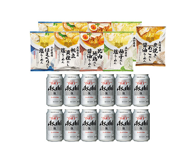 - スーパードライ350ml×12、tabete だし麺(千葉県産はまぐりだし塩らーめん108g・北海道産帆立貝柱だし塩らーめん112g・比内地鶏だし醤油らーめん101g・高知県産柚子だし塩らーめん102g×各2、長崎県産炭焼きあごだし醤油らーめん108g×1)