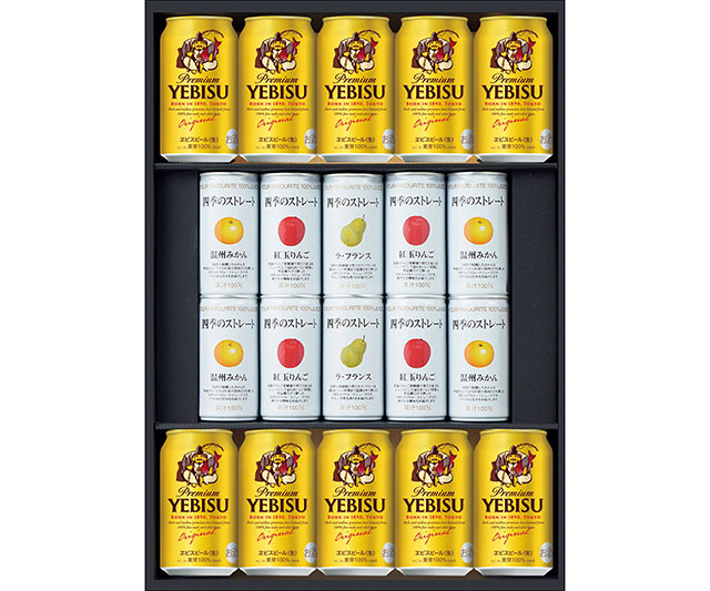 ヱビスビール350ml×10、四季のストレートジュース(温州みかん・紅玉りんご×各4、ラ フランス×2、各195g)