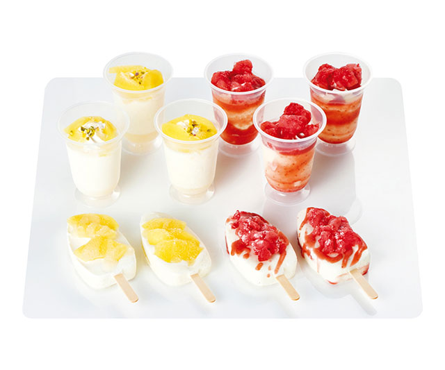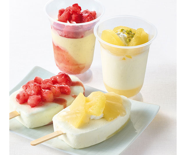 フルーツの果肉をたっぷり使ったひんやりスイーツ。りんごのやさしい甘さと爽やかな食感や、あまおうの濃厚な甘み、ミルクのコクをお楽しみください。
