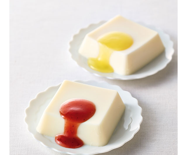 プルンとなめらかな食感の杏仁豆腐です。ソースには、濃厚な味わいのとちあいか苺と爽やかに香るゆずの2種をご用意しました。