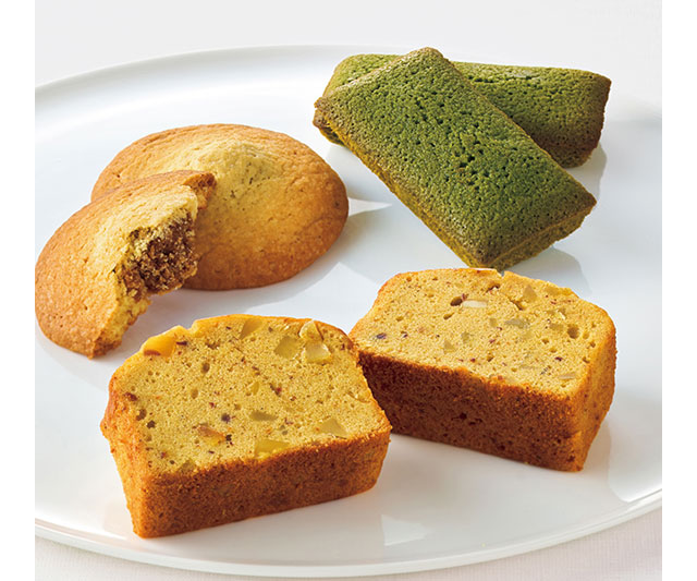茨城県産栗を使った焼菓子2種と、宇治抹茶に小豆を加えて焼きあげたフィナンシェの詰合せ。濃厚な栗の味わいとほろ苦い抹茶の風味をお楽しみください。