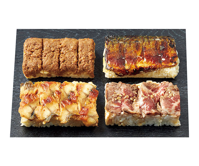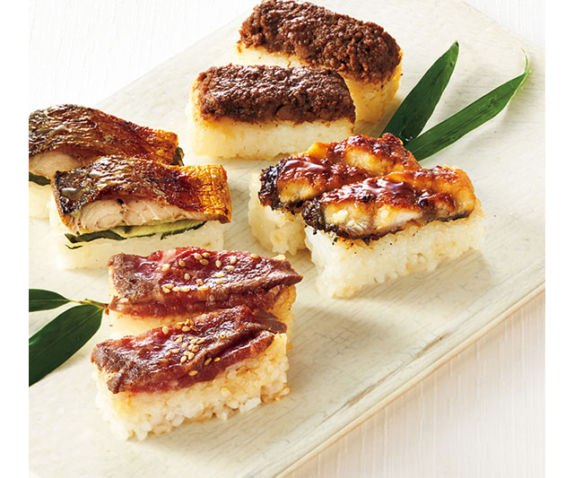 - 松阪牛ステーキ寿司・松阪牛そぼろ寿司・木曽三川うなぎ寿司各120g、国産焼きサバ寿司130g