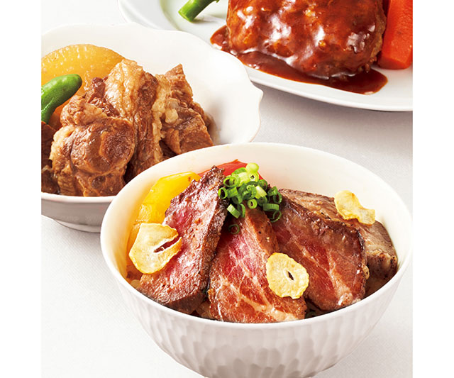 - 牛角煮140g・ステーキ丼185g・合挽きハンバーグステーキ215g×各2