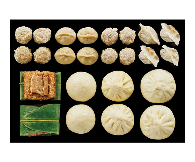 - 手包み肉まん・手包み角煮まん・角煮入り笹粽各90g×各2、黒豚餃子・黒豚焼売・糯米焼売各30g×各4、カスタードまん60g×2、手包み海老入り水餃子20g×4