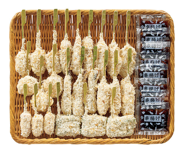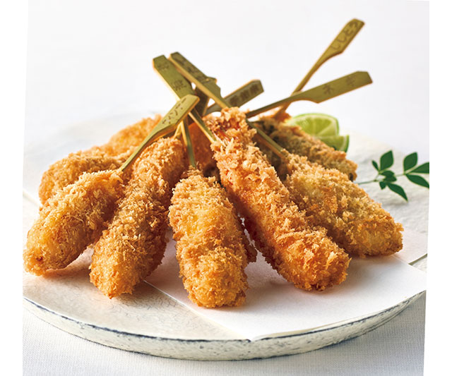 濃厚な旨みの鹿児島産黒豚や魚介など、生パン粉を使用しサクサクとした食感の串揚げに。8種類の味わいをたっぷりと詰め合わせました。