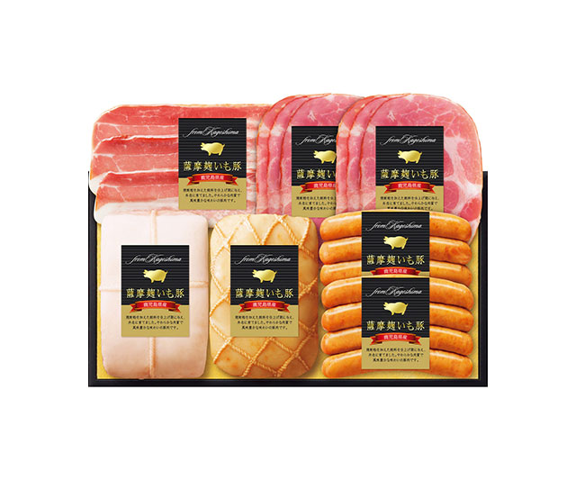 「薩摩麹いも豚」は仕上げ期に焼酎粕入り飼料を与え、丹念に育てあげた鹿児島県産のブランド豚です。ビタミンEが含まれており、もっちりと柔らかく風味も豊か。調味液の旨みをじっくり浸透させてから加熱して仕上げたハム・ベーコン・ウインナーをバラエティー豊かにご用意しました。