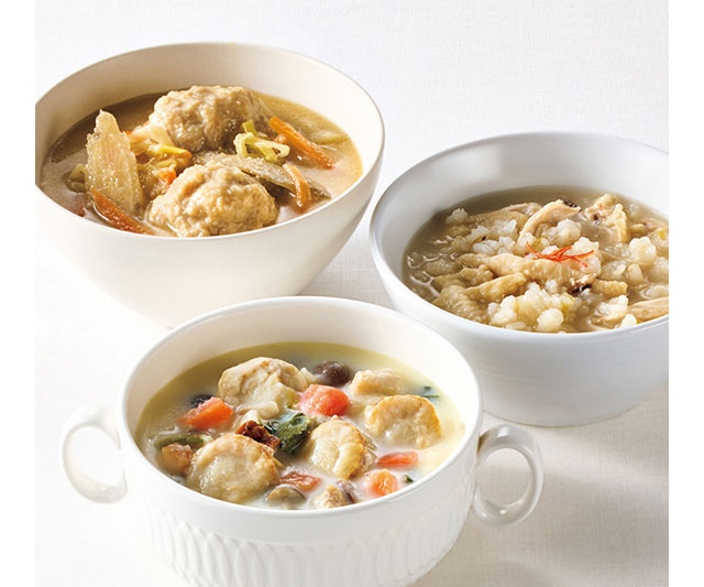 青森アップルポークの肉団子スープ(味噌仕立て)×2、青森ほたてのクラムチャウダー・あべ鶏の参鶏湯スープ×各3、各180g
