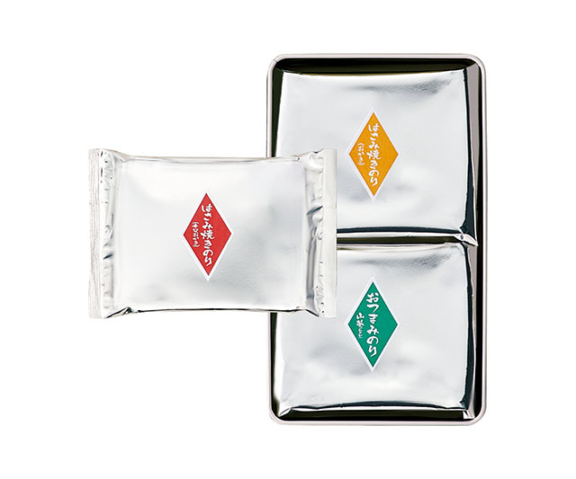 - 味付のり(山葵8切8枚×2袋)、はさみ焼き(プレーン・ピリ辛各10g×各2袋)/缶入