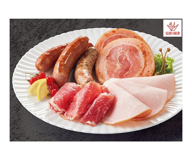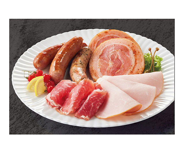 - 熟成ロースハム63g×3、ベリーハムステーキ100g・肩ロース生ハム50g・レモン風味とパセリのソーセージ80g・熟成あらびきソーセージ80g×各1/紙箱入