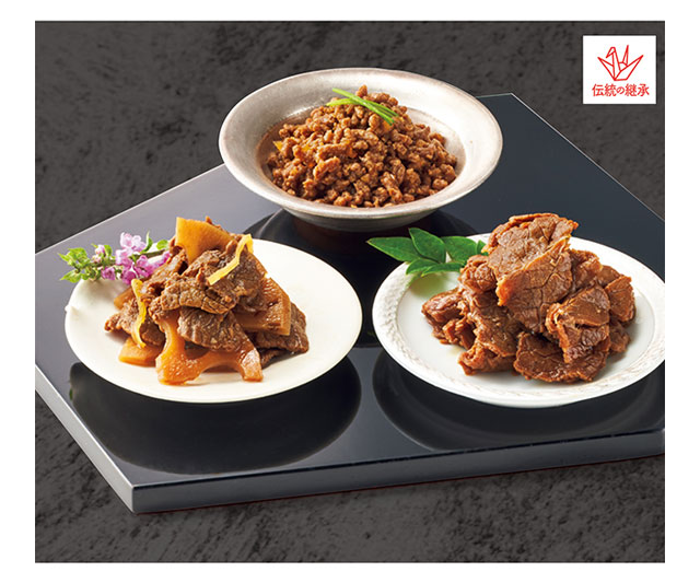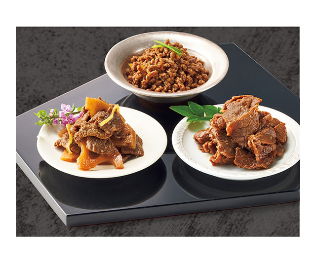 国産牛肉をすき焼風の味わいで柔らかく煮あげた「牛肉すきやき」、歯ざわりのよい「牛肉れんこん」など、ご飯にもお酒にもぴったりな、牛肉佃煮3種の詰合せです。