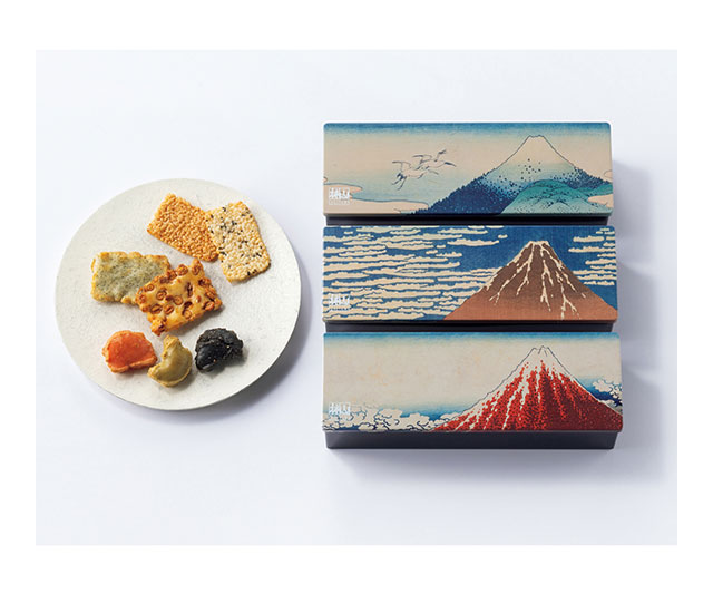 もち米一粒一粒の食感を活かした薄焼きおかき「慶長」、もち米の旨みと香ばしさが広がる「かきもち」、ふんわりとした食感が特徴のあられ「古乃端」。〈赤坂柿山〉を代表する商品3種を詰め合わせました。