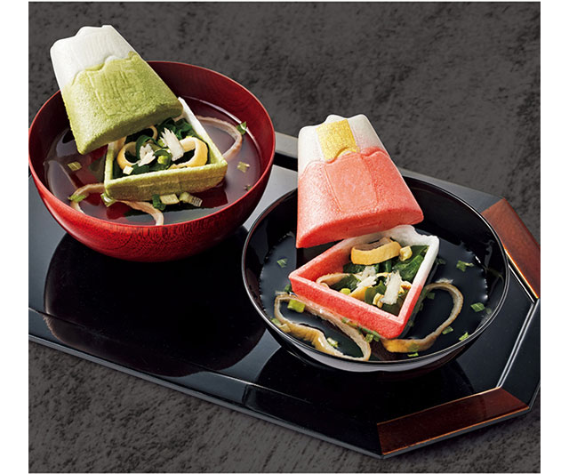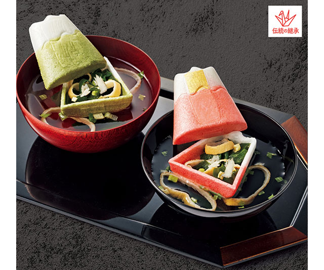 - お吸物(富士九条ねぎ(湯葉)×3、赤富士九条ねぎ(花麩)・青富士九条ねぎ(鯛)×各2、金箔貼り赤富士九条ねぎ(鯛)×1)/紙箱入