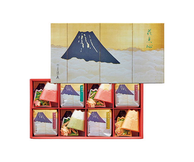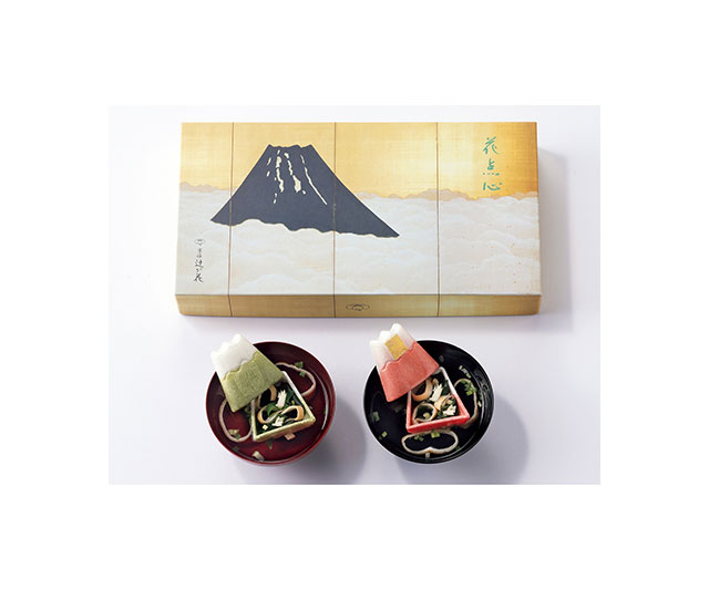 富士山型の最中に、九条ねぎなどこだわりの素材を入れたお吸物セット。金箔付きの最中を含む、おめでたい席にもおすすめの詰合せです。