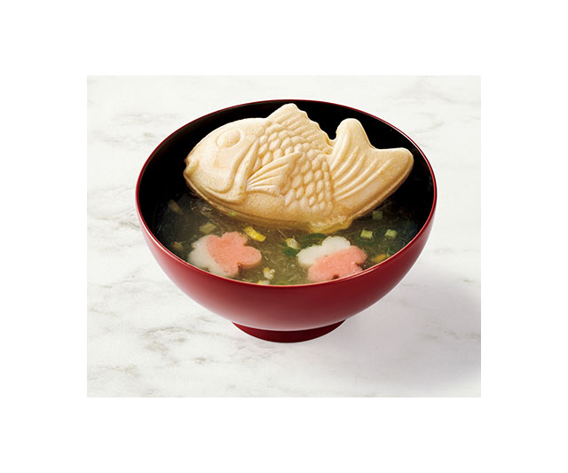 鯛の形をした最中にお湯を注ぐと、鰹だしの豊かな香りが広がります。梅の花をかたどった麩が彩りを添え、迎春の席にもふさわしい華やかなお吸物です。