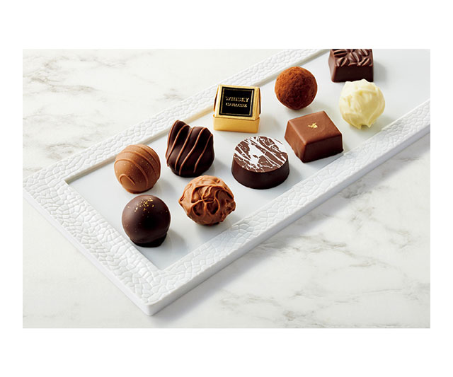 桃やライムの果汁感が広がる「フルーツ」、コニャックやラムが香る「洋酒」など、さまざまな素材と口どけなめらかなチョコレートが織りなすハーモニーをお楽しみください。