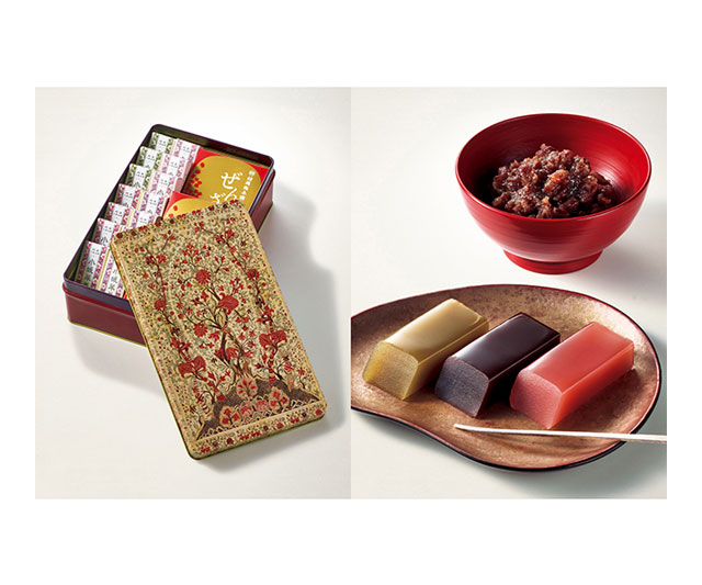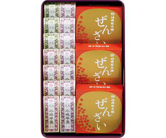 - 小型小城羊羹(本煉・小倉×各4、紅煉・抹茶×各3)、ぜんざい×3/缶入