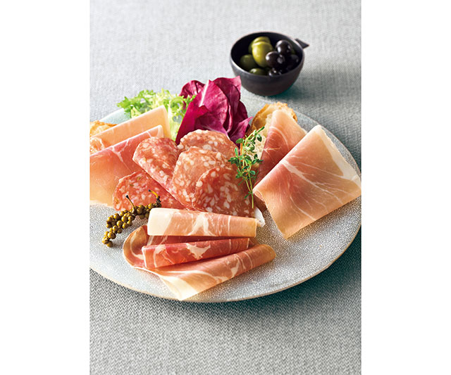 - ハモンセラーノ25g/スペイン製、ジャンボンサヴォワ25g、ソシソンセック・サラミフィノッキエット各40g/フランス製、ガンダハム25g/ベルギー製