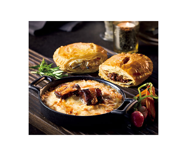 サクサク食感をお楽しみいただけるパイ包みと濃厚な味わいのドリアを詰め合わせました。パイ包みは粗挽き肉を使った肉感の強いミートパイと、芳醇な香りと旨みが広がるポルチーニのパイ。コク深いデミグラスミートドリアと、海老の旨みが際立つアメリケーヌソースドリアもご堪能いただけます。