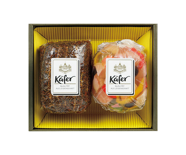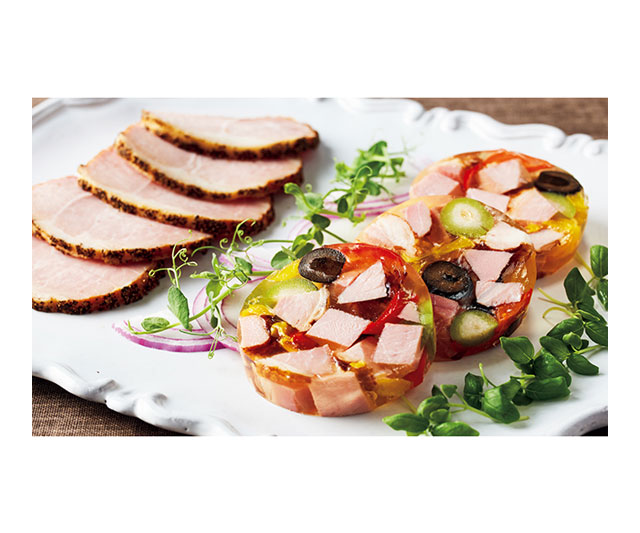 ハムと彩り豊かな野菜のゼリー寄せ「アスピーク」、豚もも肉に粗挽きのブラックペッパーをまぶして香り高く燻煙したボンレスハムを詰め合わせました。