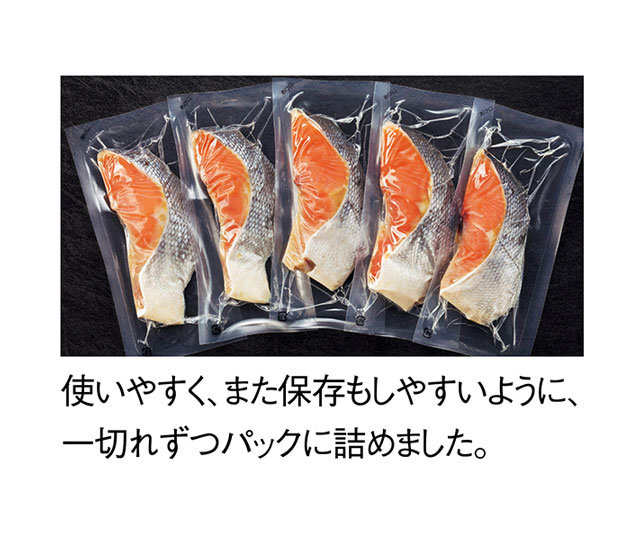 北海道で漁獲された秋鮭の中でも、特に身が美味な「銀毛」と呼ばれるオスの秋鮭を選りすぐりました。これを塩と鮭を交互に積みあげる北海道伝統製法の「山漬け」にし、余分な水分を抜いてから「寒風干し」で深い旨みを引き出しました。鮭の旨みを余すところなく、ご堪能いただけます。