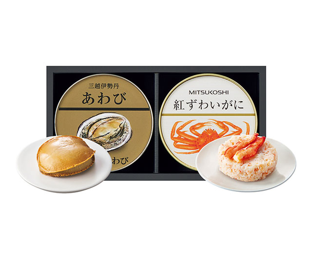 【お歳暮 三越伊勢丹限定】三越伊勢丹 国産メガイあわび缶詰・三越 国産紅ずわいがに缶詰詰合せ *