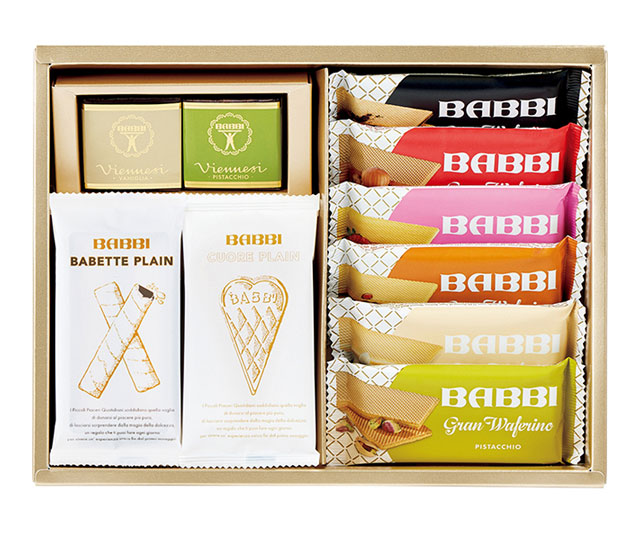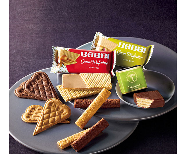 薄いクレープ生地を重ねハート型に焼いた「クオーレ」、存在感のある大きめのウエハース「グランワッフェリーニ」など、イタリアで長く愛される〈バビ〉の銘菓をお届けします。