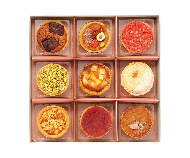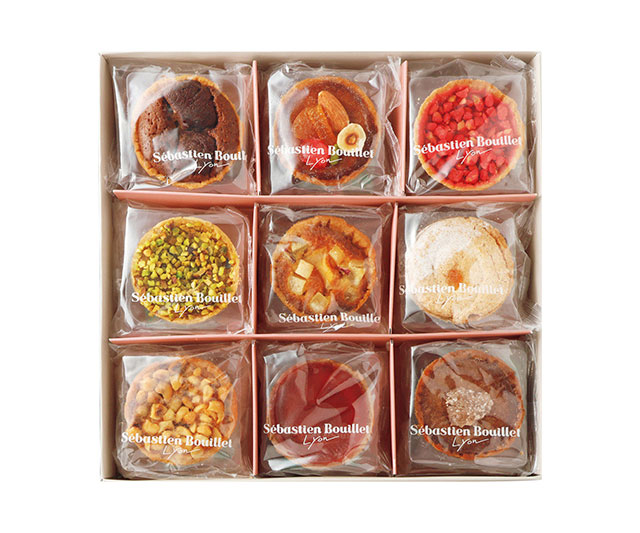 フランスに本店を構える〈セバスチャン・ブイエ〉がお届けする、多彩なタルトレット。タルト生地にマドレーヌやフィナンシェなどを入れ、ドライフルーツやナッツを重ねました。