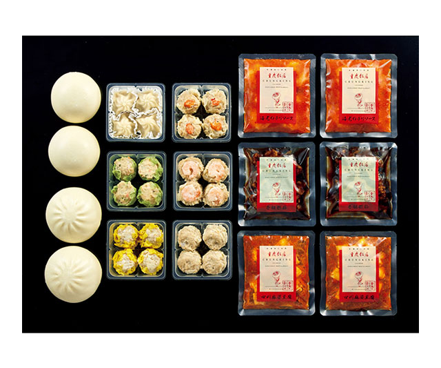 - 重慶焼売・海老焼売・いか焼売・蟹焼売・野菜焼売・小籠包×各4、海老のチリソース180g・四川麻婆豆腐180g・香醋酢豚160g・重慶肉まん・中華あんまん×各2